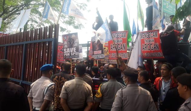 TANGERANGNEWS.com—Ratusan buruh yang tergabung dalam Serikat Pekerja Seluruh Indonesia (SPSI) mendemo kantor distributor Gudang Garam, PT Surya Madistrindo, di Kecamtan Jatiuwung, Kota Tangerang, Kamis (31/10/2019).
