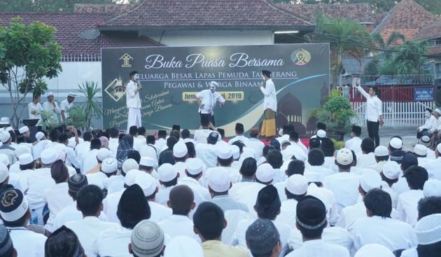 Acara buka puasa bersama yang diikuti ribuan warga binaan dan pegawai tersebut dilangsungkan di Lapangan Lapas Pemuda Tangerang, Jumat (24/5/2019).
