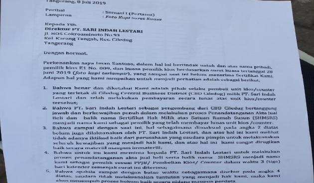 TANGERANGNEWS.com-Pemilik kios Central Business District (CBD) Ciledug, Kota Tangerang kembali meradang. Kali ini, mereka melayangkan surat somasi kepada pengembang CBD Ciledug, PT Sari Indah Lestari. Padahal, PT Sari Indah Lestari mengklaim akan menyelesaikan seluruh permasalahan hak kepemilikan kios.