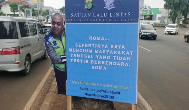 Papan imbauan itu pun dilengkapi dengan gambar salah satu anggota Satlantas Polres Tangsel, dengan ekspresi wajah dan pose sesuai dengan kalimat tersebut.
