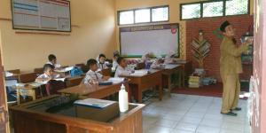 TANGERANGNEWS.com-Sekolah di Cilegon mulai memberlakukan kegiatan belajar mengajar (KBM) tatap muka hari ini, Selasa (4/8/2020). Siswa hingga guru di SDN Kedalemn I menerapkan protokol kesehatan di dalam dan luar kelas
