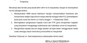 Beredar surat edaran dari Dinas Pendidikan Kabupaten Tangerang, yang menetapkan pembelajaran jarak jauh (PJJ) sekolah bagi tingkat PAUD, SD dan SMP, pada Senin 01 September 2025.