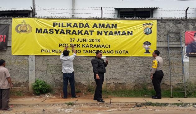 TANGERANGNEWS.com-Jajaran Polsek Karawaci memasang spanduk bertemakan Pilkada Aman dan Nyaman di Kota Tangerang, Kamis (21/6/2018). Hal tersebut mengingat pencoblosan pemilihan Wali Kota dan Wakil Wali Kota Tangerang kian mendekat yaitu pada 27 Juni 2018.