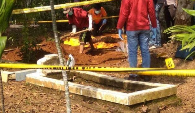Penggalian makam berlangsung menghebohkan setelah muncul anggota badan manusia masih berpakaian utuh. Selanjutnya, Tim Identifikasi Polres Lebak melanjutkan penggalian.