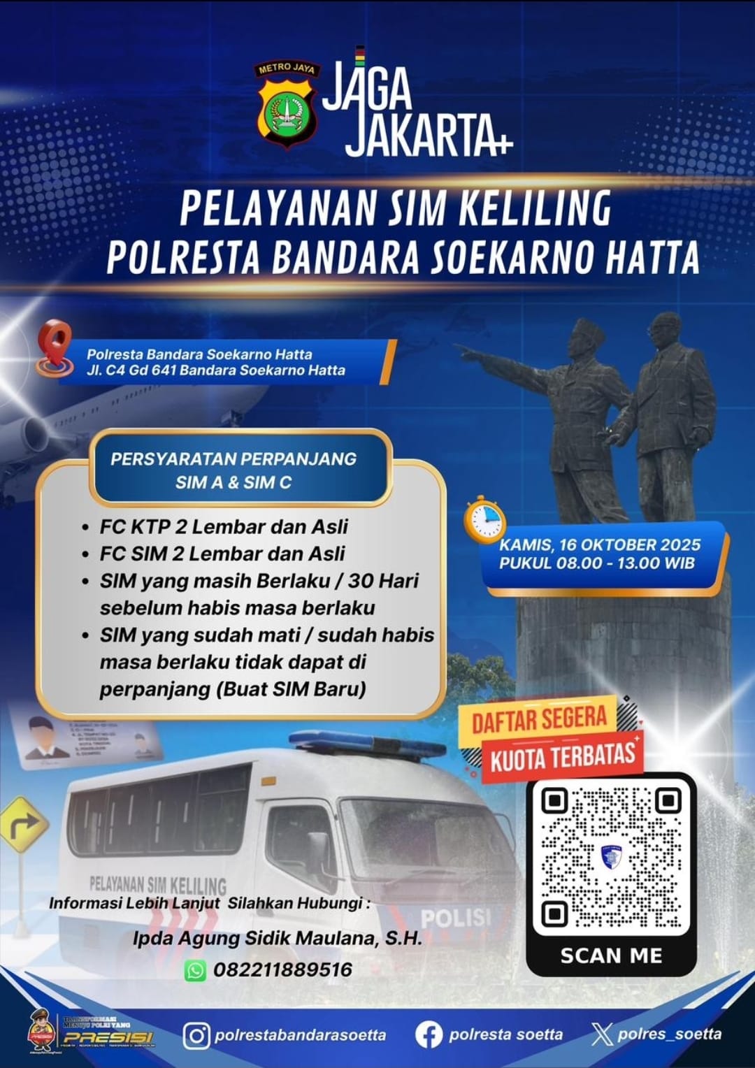 Pelayanan SIM Keliling ini akan dilaksanakan pada Kamis, 16 Oktober 2025, pukul 08.00 - 13.00 WIB di Mapolresta Bandara Soekarno-Hatta, Kota Tangerang.