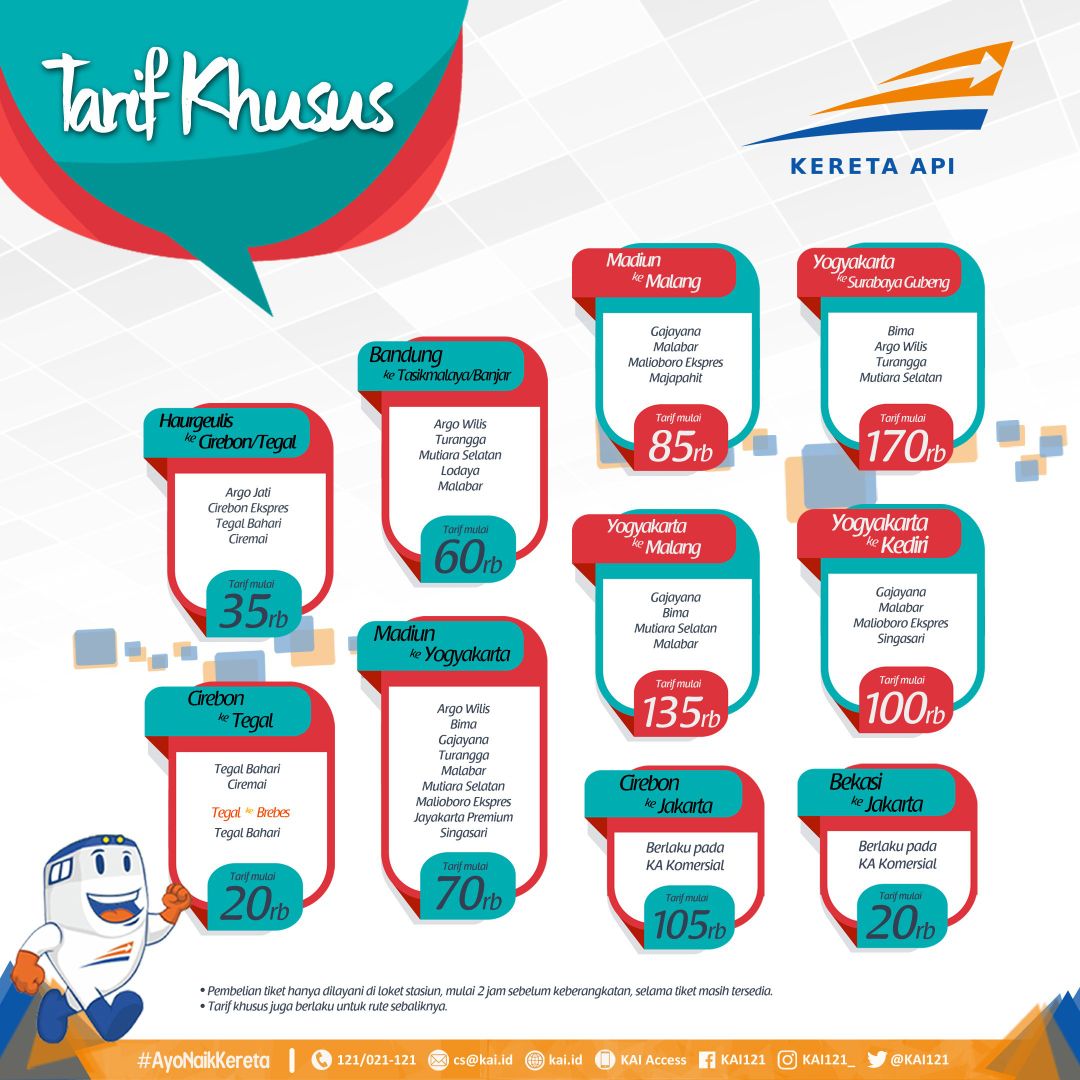 • Rute Yogyakarta- Kediri : tarif mulai 100 ribu. Berlaku pada Gajayana, Malabar, Malioboro Ekspres, Singosari.