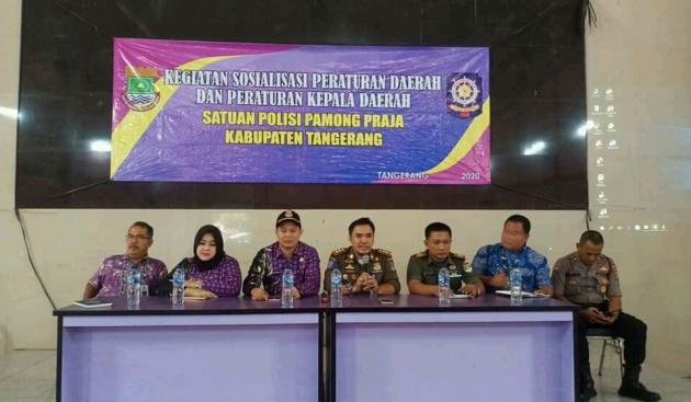 TANGERANGNEWS.com-Satuan Polisi Pamong Praja (Satpol PP) Kabupaten Tangerang menggelar kegiatan Sosialisasi Peraturan Daerah dan Kepala Daerah Polisi Pamong Praja kepada para pedagang kaki lima yang berjualan di seputar Jalan RayanSerang, Bitung, Curug, Rabu (6/2/2019).