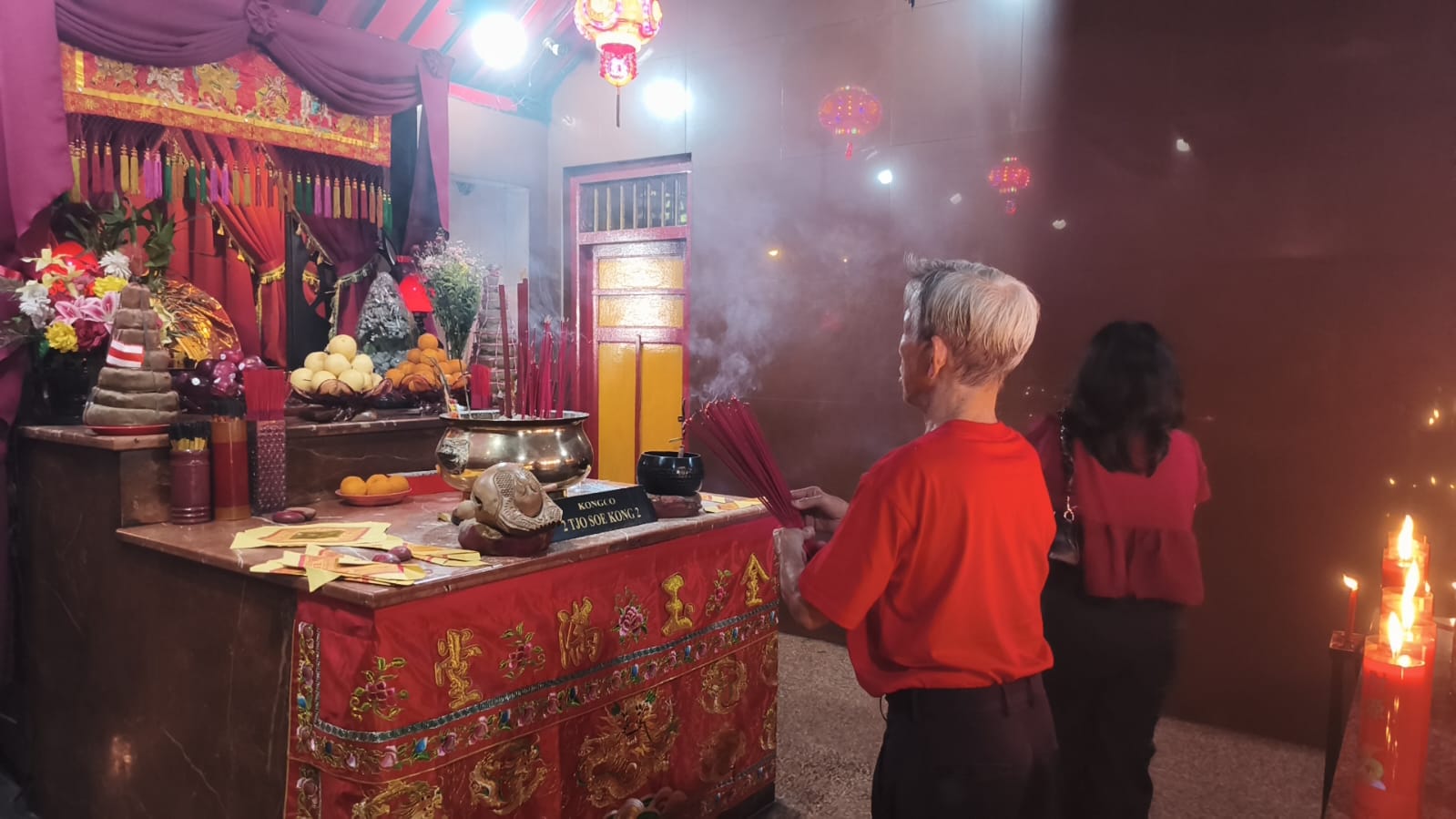 ‎Jemaat silih berganti memasuki ruang utama Vihara dengan terlihat mengenakan pakaian bernuansa merah dan emas, menyalakan dupa, serta memanjatkan doa dengan khusyuk.