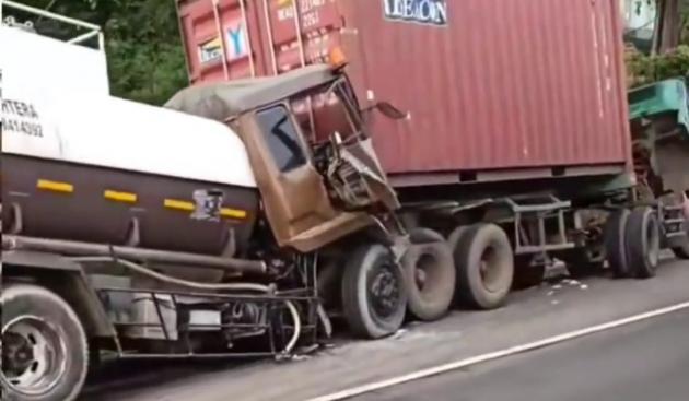 Berdasarkan video yang tersebar di media sosial, terlihat truk tangki menabrak bagian belakang truk tronton di jalur darurat. Kondisi bagian depan truk tangki ringsek.