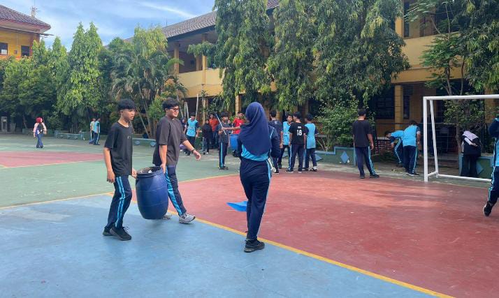 Para siswa membersihkan ruang kelas, halaman, hingga titik-titik genangan air.