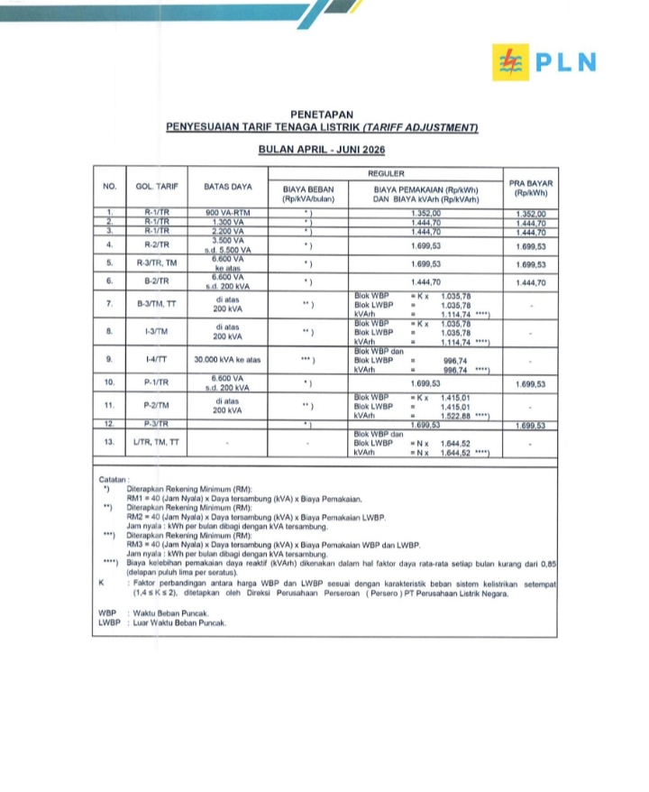 Tarif ini juga tercantum dalam dokumen berjudul “Penetapan Penyesuaian Tarif Tenaga Listrik (Tariff Adjustment) Bulan April - Juni 2026” yang memuat daftar golongan tarif, batas daya, hingga biaya pemakaian pelanggan reguler dan prabayar.