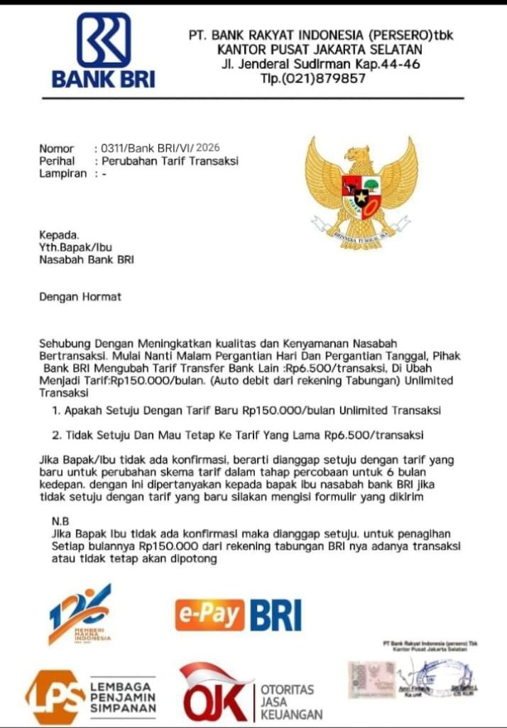 BRI memastikan, hingga saat ini tidak ada perubahan tarif transaksi seperti yang disebutkan dalam surat tersebut. Tarif transfer antarbank masih tetap Rp6.500 untuk metode transfer online, sementara melalui sistem BI-FAST dikenakan biaya Rp2.500 per transaksi.