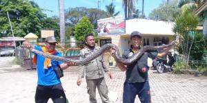 TANGERANGNEWS.com - Warga Kampung Begog di Desa Pekayon, Kecamatan Sukadiri, Kabupaten Tangerang, Banten, menangkap ular sanca kembang sepanjang sekitar tiga meter yang berkeliaran di sekitar jalan raya