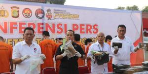 TANGERANGNEWS.com-Pihak kepolisian menangkap empat tersangka berinisial HS, 28, FV, 32, YH, 28, dan NF, 28, yang merupakan kurir narkoba jenis ganja seberat 304,1 kg lintas Sumatera-Jawa di Kota Tangerang.