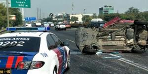 TANGERANGNEWS.com-Kecelakaan hebat terjadi di KM 21.200 A Tol Jakarta - Tangerang Bitung, Jumat (14/9/2018). Dua mobil pribadi terbalik setelah menabrak trailer yang sedang menepi di bahu jalan tol.