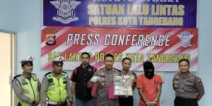 TANGERANGNEWS.com-Iwan, 38, hanya bisa tertunduk dengan tangan diborgol. Pria bertato di tangan kanannya itu ditangkap personel Satuan Lalu Lintas (Satlantas) Polresta Tangerang