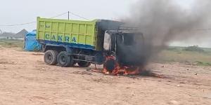 Truk pengangkut tanah yang beroperasi di kawasan Teluknaga, Kabupaten Tangerang, menjadi bulan-bulanan kerusuhan pada Kamis, 7 November 2024.