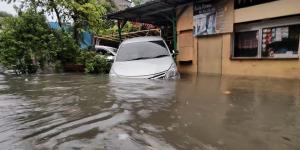 Hujan deras yang mengguyur wilayah kota Tangerang dan sekitarnya sejak sore tadi menyebabkan banjir melanda berbagai kawasan di Kota Tangerang termasuk Alam Sutera, Minggu 6 Juli 2025.