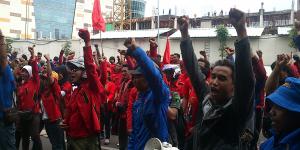 Ratusan buruh dari berbagai elemen kembali melakukan aksi unjuk rasa, Senin (28/10) siang. Dalam aksinya, mereka nekat hendak memblokir Tol Bitung. Namun, upaya mereka gagal karena sejumlah anggot kepolisian telah memblokade aksi mereka