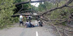 Tiga pengendara motor terluka cukup parah usai tertimpa pohon asem yang tumbang di Jalan MH Thamrin, Kelurahan Cikokol, Kecamatan Pinang, Kota Tangerang, Rabu 05 Maret 2025.