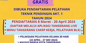 Rabu, 13 Maret 2024 | 13:18BLK Kota Tangerang Buka Pendaftaran Pelatihan Teknik Pendingin, Gratis!Dinas Ketenagakerjaan (Disnaker) Kota Tangerang kembali membuka pendaftaran untuk Pelatihan Teknik Pendingin Angkatan I di Balai Latihan Kerja (BLK), mulai 8 Maret-20 April 2024.