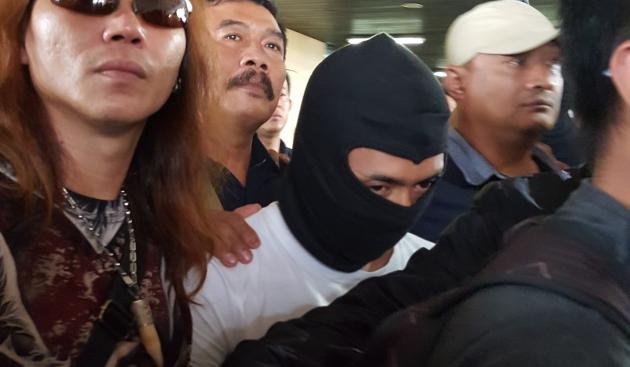 Tersangka Kusmayadi alias Agus saat tiba di Bandara Soekarno-Hatta, Tangerang, Banten mendapat pengawalan petugas kepolisian. (@TangerangNews.com / Raden Bagus Irawan)