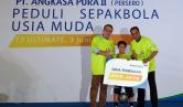 Pesepak bola cilik yang tengah berlatih di Ajax Amsterdam Tristian Alif (tengah) bersama mantan pemain sepak bola Indonesia Rocky Putiray (kanan) menunjukan kebolehannya memainkan bola. (@TangerangNews 2016 / Raden Bagus Irawan)