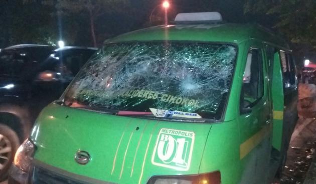 Angkot R01 dipecah kaca bagian depannya oleh driver ojek online. Peristiwa itu terjadi bagian dari aksi balasan atas penyerangan yang dilakukan pengemudi angkot kepada driver ojek online. (@tangerangnews 2017 / Rangga A Zuliansyah)