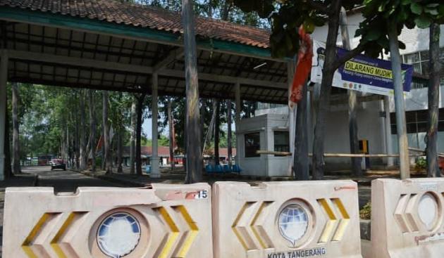 Pintun kedatangan bus AKAP yang di tutup oleh pembatas jalan dan spanduk bertuliskan "Dilarang Mudik". (@TangerangNews / yudisald)