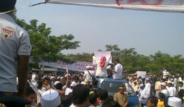 Mereka pun menggelar aksi portes selama 3 jam menuntut pihak dari Komplek Tarakanita untuk membatalkan rencana pembangunan Gereja tersebut, Minggu (22/9).