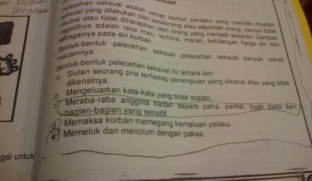 Dalam pembahasan bentuk pelecehan seksual tersebut ada kata-kata  menyebutkan alat kelamin dan bagian sensitif secara vulgar.