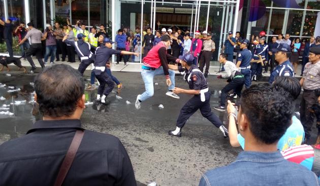 Selanjutnya sesi ketiga, adalah penanganan pertama huru hara oleh security mall sebelum polisi datang. Puluhan masa yang hendak menjarah mall dihadapi oleh security yang dilengkapi dengan body protector serta tameng. Setelah sempat bentrok selama bebeapa menit, akhirnya masa bisa dikendalikan dan sejumlah provokator diamankan.