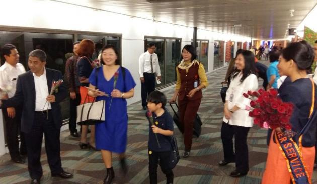 Dua orang penumpang dari penerbangan tersebut mendapat pengalungan bunga secara simbolik dari manajemen PT Angkasa Pura II dan souvenir yang dikemas berbeda dari penumpang lainnya.