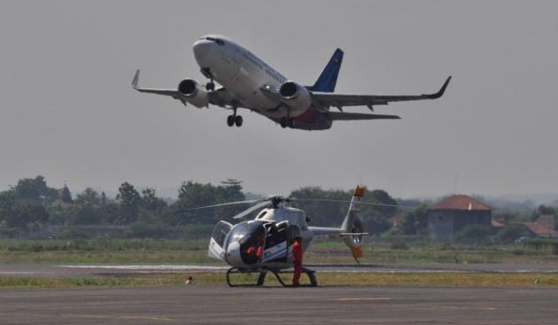 Pesawat saat tengah terbang rendah atau sedang take off diatas Helikopter. (Dira Derby / TangerangNews.com)