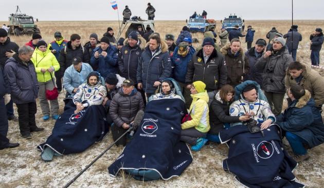 Volkov yang pertama keluar dari kapsul dan disambut oleh ayahnya Alexander Volkov, yang juga kosmonot. Kelly yang keluar berikutnya, melambaikan tangannya dengan bersemangat dan tersenyum sebelum melakukan percakapan lewat satelit. Kornienko keluar paling akhir. Ketiganya langsung diberi selimut dan mendapatkan penanganan khusus oleh tim yang sudah siaga di lokasi.