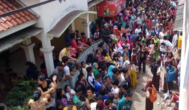 Para warga ini tampak memadati jalan kecil di depan kontrakan yang berada di kawasan padat penduduk ini. Kebanyakan mereka penasaran ingin melihat tersangka pemutilasi, Kusmayadi alias Agus.