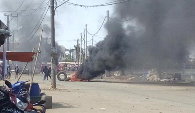 Ratusan warga yang menempati bangunan liar di Dadap, Kosambi, Kabupaten Tangerang sempat membakar ban untuk melawan petugas gabungan. (Rangga A Zuliansyah / TangerangNews)