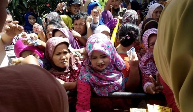 Ratusan warga yang mayoritas para ibu-ibu tersebut tak sabar mengantri hingga melakukan aksi dorong-dorongan untuk bisa membeli kupon yang dapat ditukarkan dengan sembako murah. Bahkan, beberapa diantaranya terjepit dan terjatuh akibat berdesak-desakan.