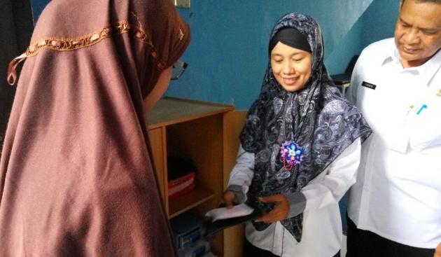 Seorang guru memberikan pembalut kepada Siswi di Sekolah.Program ini adalah salah satu bagian dari program Dinas Pendidikan Kota Tangerang untuk menyediakan fasilitas toilet yang ramah, Kamis (16/03/2017). (Tangerangnews / Rangga A Zuliansyah)