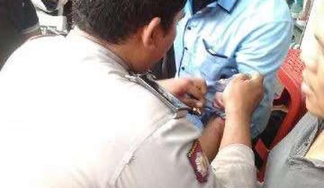 Salah seorang petugas polisi berpakaian preman terkena serempet senjata api dari kawanan begal motor. (@tangerangnews 2017 / Mohamad Romli)