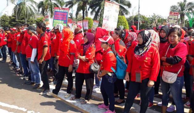 Pada hari buruh internasional (May Day), tampak ratusan buruh dari berbagai serikat, melakukan aksi demo di depan kantor Wali Kota Tangerang, Senin (1/5/2017). (@TangerangNews2017 / Rangga A Zuliansyah)