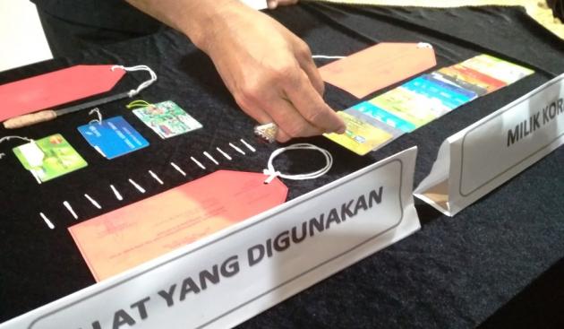 Polisi menyita barang bukti berupa uang tunai Rp1,6 juta, 15 kartu ATM berbagai jenis, 3 kartu ATM yang digunting sudutnya dan diberi tali, satu buah gergaji kecil dan potongan tusuk gigi yang digunakan pelaku dalam aksinya. Keduanya kini dijerat Pasal 363 KUHP tentang Pencurian dengan Pemberatan.