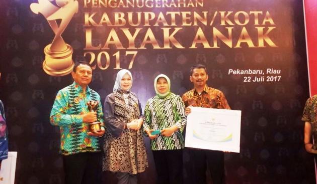 Hal itu dibuktikan dengan membawa dua penghargaan sekaligus pada acara malam puncak penanugerahan Kabupaten/Kota Layak Anak tahun 2017 dalam rangka Hari Anak Nasional tahun 2017 di Pekanbaru, Riau, Sabtu (22/7/2017).