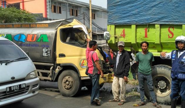 TANGERANGNEWS.com-Akibat kehilangan kendali, truk tangki air bernopol B-9018-GFU yang dikendarai Jumroni, menghajar truk tanah di Jalan Raya M Toha Km 49, Kecamatan Periuk, Kota Tangerang, Selasa (10/10/2017).