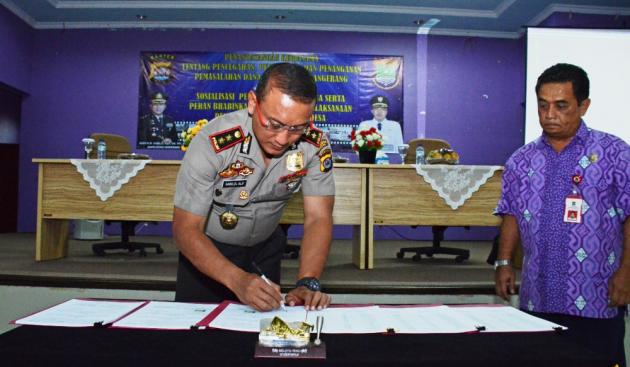 TANGERANGNEWS.com-Kapolresta Tangerang, AKPB Sabilul Alif bersama dengan Kepala Dinas Pemberdayaan Masyarakat, Pemerintahan Desa (DPMPD) Kabupaten Tangerang Indarto menandatangi MoU pencegahan, pengawasan dan penanganan dana desa di Gedung Graha Pemuda, Kamis (16/11/2017).