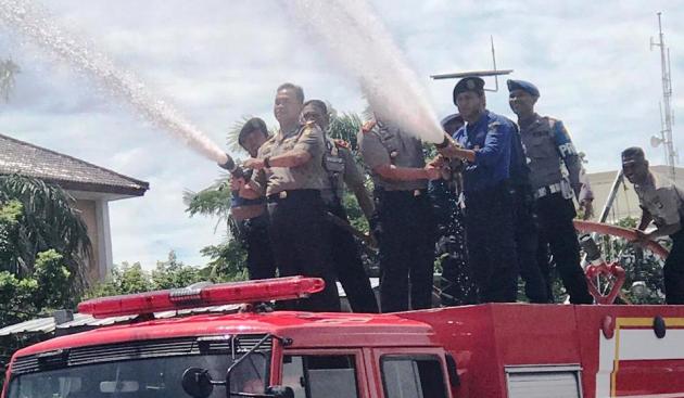 TANGERANGNEWS.com - Ada saja cara unik pihak kepolisian Polrestro Tangerang Kota dalam merayakan kenaikan pangkat anggotanya, yakni dengan disemprot air dari mobil pemadam kebakaran.
