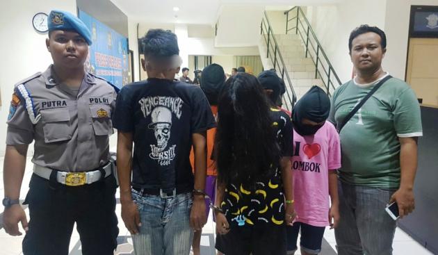 Kawanan yang Merampok Taksi di Pondok Aren, Bintaro, terdiri dari SA,17 tahun, IA ,15 tahun,dan N ,21 tahun dan dua orang perempuan RL, 12, serta LA, 18, diamankan di Mapolres Tangsel. (@TangerangNews / Yudi Adiyatna)