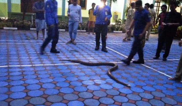 Teguh pun bahu membahu untuk mengamankan keberadaan ular sanca itu dan berhasil dievakuasi pada pukul 18.00 WIB.