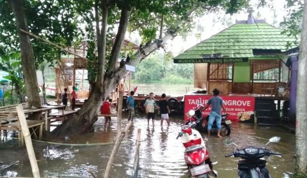 Salah satu lokasi yang telah tergenang air adalah sekretariat komunitas Tabur Mangrove, komunitas pegiat lingkungan hidup di desa setempat.