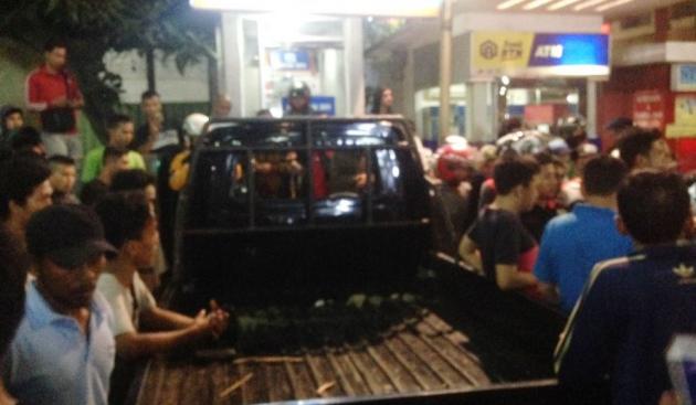 Sebuah mobil pick up jenis Suzuki Carry menjadi sasaran amukan warga setelah menabrak dua orang pengendara motor di Jalan Siliwangi, Pamulang dini hari tadi, Minggu (25/2/2018). (@TangerangNews / Yudi Adiyatna)